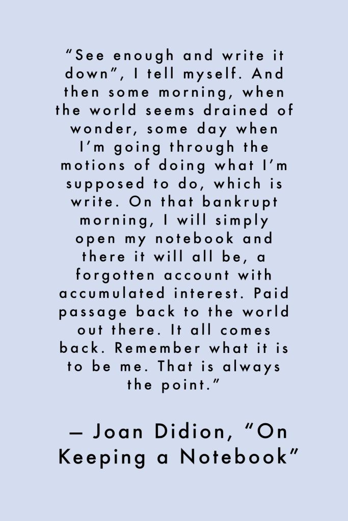 Virginia Woolf’s “Writer’s Diary” (edited and compiled from her lengthy diary volumes by her loyal and often overlooked husband, Leonard Woolf, after her suicide) is often recommended as a guide to writers. It’s certainly a valuable insight into the creative mind. However this short essay on keeping a writer’s notebook by Joan Didion, an acclaimed American journalist and writer who died in 2021 is also worth considering.